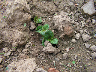 But these tomatoes have finally set their first new leaves. It's been too cold for them, but they weren't doing well inside in the flats so I jumped the gun and moved them out. They are surviving and hopefully the warm weather will kick them into gear. They are planted from seed saved from my husband's grandmother's tomatoes, so they are worth growing out even if they never become very strong. Our other plants will be purchased from a nursery.